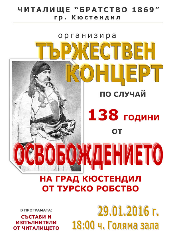 На 29 януари 2016 г. от 18:00 ч. в Голямата зала на читалище „Братство 1869" ще се проведе Тържествен концерт по повод 138 г. от Освобождението на Кюстендил от турско робство.