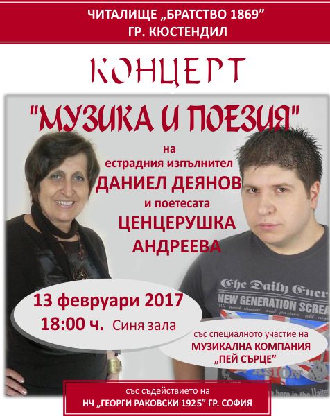 На 13 февруари 2017 г. от 18:00 ч. в Синята зала на читалище „Братство 1869” гр. Кюстендил ще се проведе Концерт "Музика и поезия" на естрадния изпълнител Даниел Деянов и поетесата Ценцерушка Андреева. В програмата ще се включат и изпълнителите от Музикална компания „Пей сърце” към читалището.