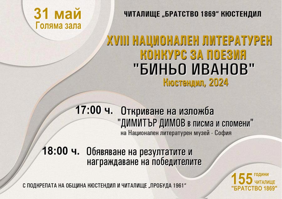 На 31 май 2024 г. от 18:00 ч. в Голямата зала на читалище „Братство 1869” Кюстендил ще се състои Официалното награждаване на победителите в Осемнадесетия национален литературен конкурс за поезия „Биньо Иванов“ 2024.